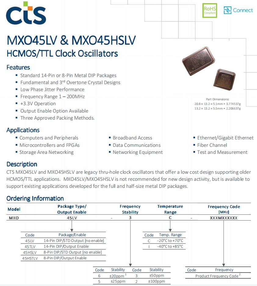 MXO45HSLV-3C-45M0000,6G網(wǎng)絡設備晶振,CTS西迪斯晶振,美國CTS晶振,進口晶振,型號MXO45HSLV,編碼為MXO45HSLV-3C-45M0000,頻率為:45.000MHz,尺寸:13.2×13.2×5.5mm,2.206637g,是傳統(tǒng)的通孔時鐘振蕩器,有源晶振,石英晶體振蕩器,提供了一個低成本的設計,支持舊的HCMOS/TTL應用程序。MXO45LV/MXO45HSLV不推薦用于新的設計活動,但可用于支持為全尺寸和半尺寸金屬DIP包開發(fā)的現(xiàn)有應用程序。特點標準14針或8針金屬芯片封裝,基本和第三泛音晶體設計,低相位抖動性能,+3.3V操作,輸出啟用選項可用,三種批準的包裝方法。應用應用,計算機和外設,微控制器和FPGAs,存儲區(qū)域網(wǎng)絡,寬帶訪問,數(shù)據(jù)通信,網(wǎng)絡設備,以太網(wǎng)/千兆以太網(wǎng),光纖通道,測試和測量。