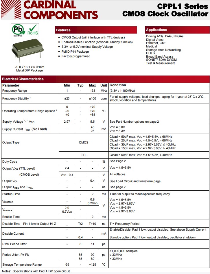 CMOS時鐘振蕩器,CPPLC1LTA7BP125.0TS,卡迪納爾石英晶振,參數表