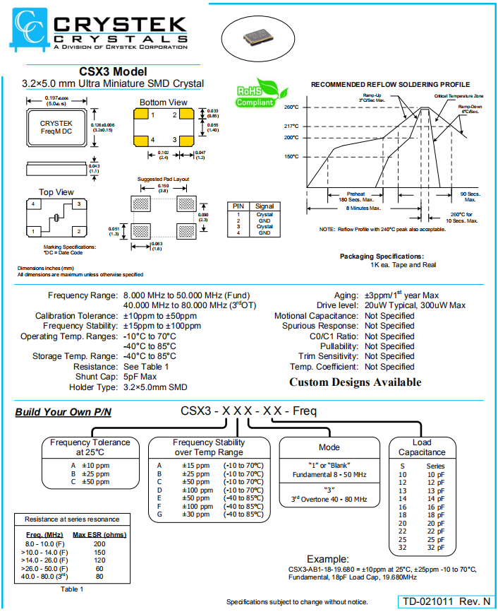 CRYSTEK晶振,CSX3晶振,無源環保晶體.小型表面貼片晶振型,是標準的石英晶體諧振器,適用于寬溫范圍的電子數碼產品,家電電器及MP3,MP4,播放器,單片機等領域.可對應8.000MHz以上的頻率,在電子數碼產品,以及家電相關電器領域里面發揮優良的電氣特性,滿足無鉛焊接的回流溫度曲線要求.