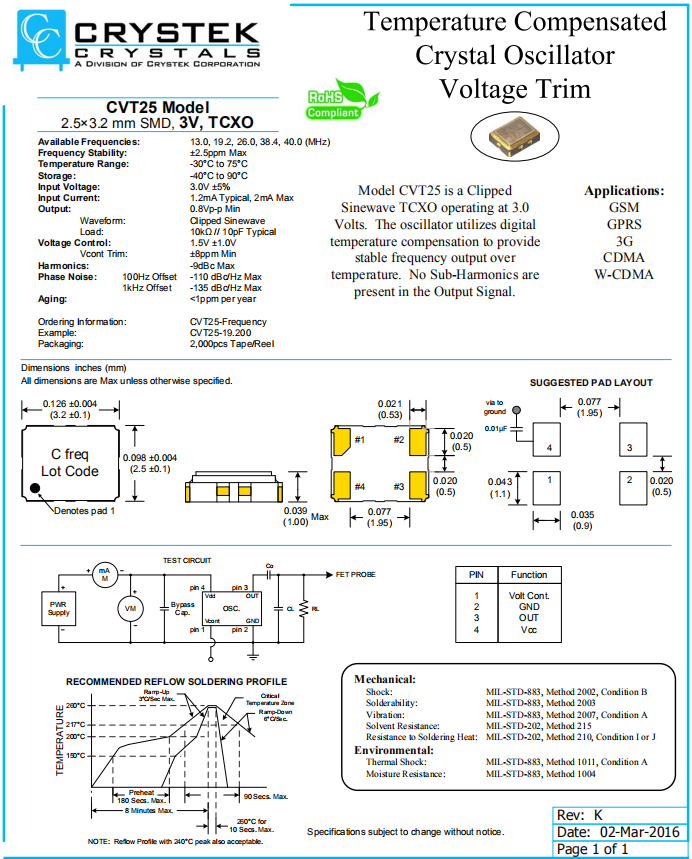 CRYSTEK晶振,CVT25晶振,溫補晶體振蕩器.小型SMD有源晶振,從最初超大體積到現在的7050mm,6035mm,5032mm,3225mm,2520mm體積,有著翻天覆地的改變,體積的變小也試產品帶來了更高的穩定性能,接縫密封石英晶體振蕩器,精度高,覆蓋頻率范圍寬的特點,SMD高速自動安裝和高溫回流焊設計,Optionable待機輸出三態輸出功能,電源電壓范圍:1.8V?5V,高穩定性,低抖動,低功耗,主要應用領域:無線通訊,高端智能手機,平板筆記本WLAN,藍牙,數碼相機,DSL和其他IT產品的晶振應用,三態功能,PC和LCDM等高端數碼領域,符合RoHS/無鉛.