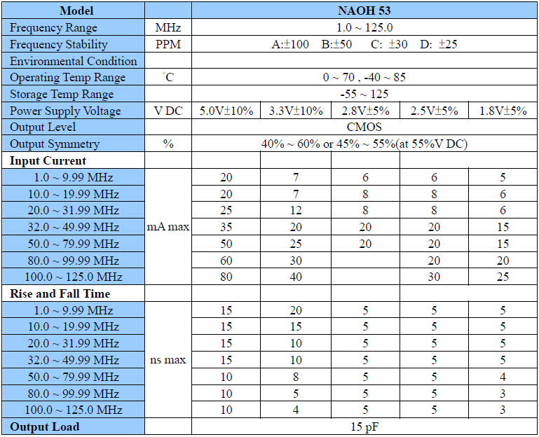 臺灣津綻晶振,NAOH-53振蕩器,5032mm貼片晶振,尺寸大小5.0*3.2*1.3mm,CMOS輸出晶體振蕩器,頻率范圍1.0 to 125.0MHZ,工作溫度-40~+85℃耐高溫環境,無縫焊接具有,優良的可焊性,符合無線環保要求,該款SMD振蕩器主要應用于:PCMCIA卡,CCD,便攜式電,無線局域網.