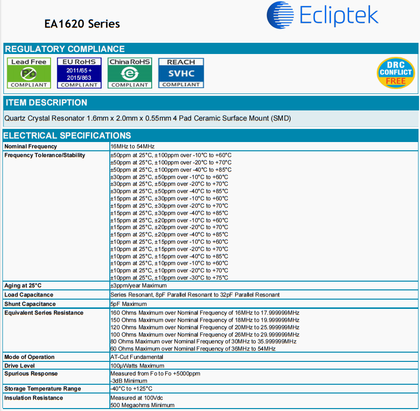 | EA1216MA08-25.000M TR | Ecliptek | EA1216 | -40°C ~ 85°C | 25 MHz | ±20ppm | ±15ppm | 8 pF |