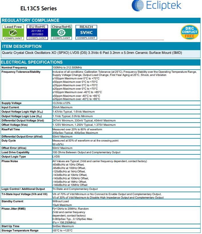 ECLIPTEK進口晶振,EL13C5差分晶振,EL13C5C2F-120.000M-TR晶振,服務是ECLIPTEK晶振成功的基石.我們時時為客戶著想,盡力滿足并超越客戶對于我們的石英晶振,貼片晶振,電壓晶體元件,晶體振蕩器,有源晶振等產品的質量要求以及服務價值.| Nominal Frequency | 100MHz to 212.500MHz |