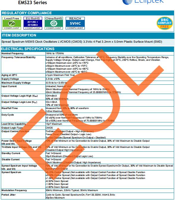 日蝕歐美晶振,EMS23有源晶體,EMS23CHA-24.000M-TR振蕩器,服務(wù)是ECLIPTEK晶振成功的基石.我們時時為客戶著想,盡力滿足并超越客戶對于我們的石英晶振,貼片晶振,電壓晶體元件,晶體振蕩器,有源晶振等產(chǎn)品的質(zhì)量要求以及服務(wù)價值.憑借先進的設(shè)備一流的技術(shù)以及公司訓(xùn)練有素的服務(wù)團隊,多方面的滿足各領(lǐng)域客戶的不同需求,從而成為晶振行業(yè)內(nèi)的最佳資源之一.