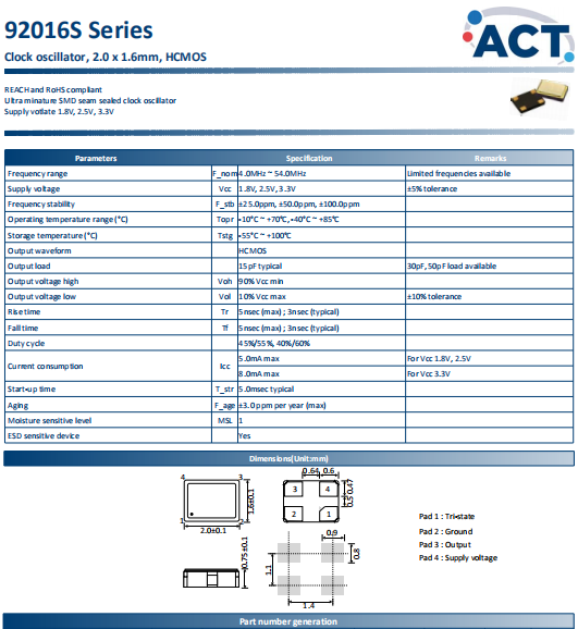 ACT晶振,92016S晶振,時鐘晶體振蕩器.貼片石英晶振,體積小,焊接可采用自動貼片系統,產品本身小型,表面貼片晶振,特別適用于有小型化要求的電子數碼產品市場領域,因產品小型,薄型優勢,耐環境特性,包括耐高溫,耐沖擊性等,在移動通信領域得到了廣泛的應用,晶振產品本身可發揮優良的電氣特性,滿足無鉛焊接的高溫回流溫度曲線要求.