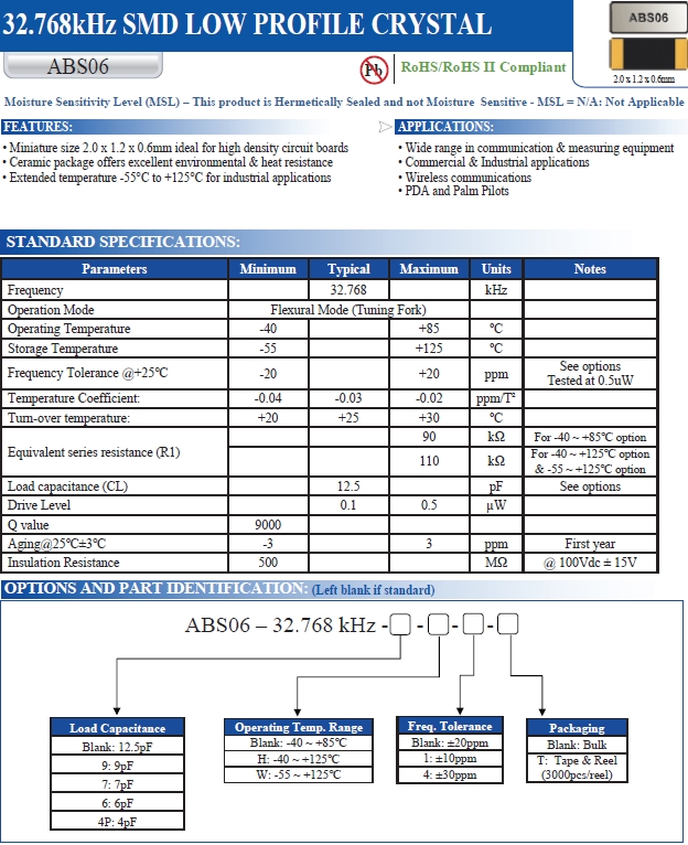 Abracon晶振, ABS06-32.768KHZ-9-T,ABS06諧振器.小型貼片石英晶振,外觀尺寸具有薄型表面貼片型石英晶體諧振器,特別適用于有小型化要求的市場領(lǐng)域,比如智能手機(jī),無線藍(lán)牙,平板電腦等電子數(shù)碼產(chǎn)品.晶振本身小型,薄型,重量輕,晶體具有優(yōu)良的耐環(huán)境特性,如耐熱性,耐沖擊性,