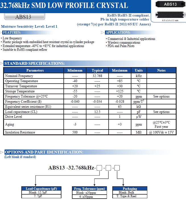 | Abracon晶振 | 單位 | ABS13晶振 | 石英晶振基本條件 |
