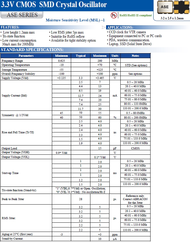Abracon晶振,ASE-25.000MHZ-LR-T振蕩子,ASE壓電晶振.小型貼片有源晶振,體積的變小也使產(chǎn)品帶來了更高的穩(wěn)定性能,接縫密封石英晶體振蕩器,精度高,覆蓋頻率范圍寬的特點(diǎn),貼片高速自動安裝和高溫回流焊設(shè)計(jì),Optionable待機(jī)輸出三態(tài)輸出功能,電源電壓范圍:1.8V?5V,高穩(wěn)定性,低抖動,低功耗,主要應(yīng)用領(lǐng)域:無線通訊,智能手機(jī),平板筆記本W(wǎng)LAN,藍(lán)牙,數(shù)碼相機(jī),DSL和各式IT產(chǎn)品的晶振應(yīng)用,三態(tài)功能,PC和LCDM等數(shù)碼領(lǐng)域,符合RoHS/無鉛.