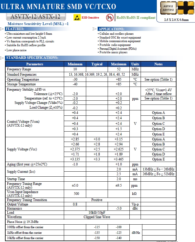 Abracon晶振,溫補振蕩器,ASTX-12有源晶振.小型貼片有源晶振,體積的變小也使產品帶來了更高的穩定性能,接縫密封石英晶體振蕩器,精度高,覆蓋頻率范圍寬的特點,貼片高速自動安裝和高溫回流焊設計,Optionable待機輸出三態輸出功能,電源電壓范圍:1.8V?5V,高穩定性,低抖動,低功耗,主要應用領域:無線通訊,智能手機,平板筆記本WLAN,藍牙,數碼相機,DSL和各式IT產品的晶振應用,三態功能,PC和LCDM等數碼領域,符合RoHS/無鉛.
