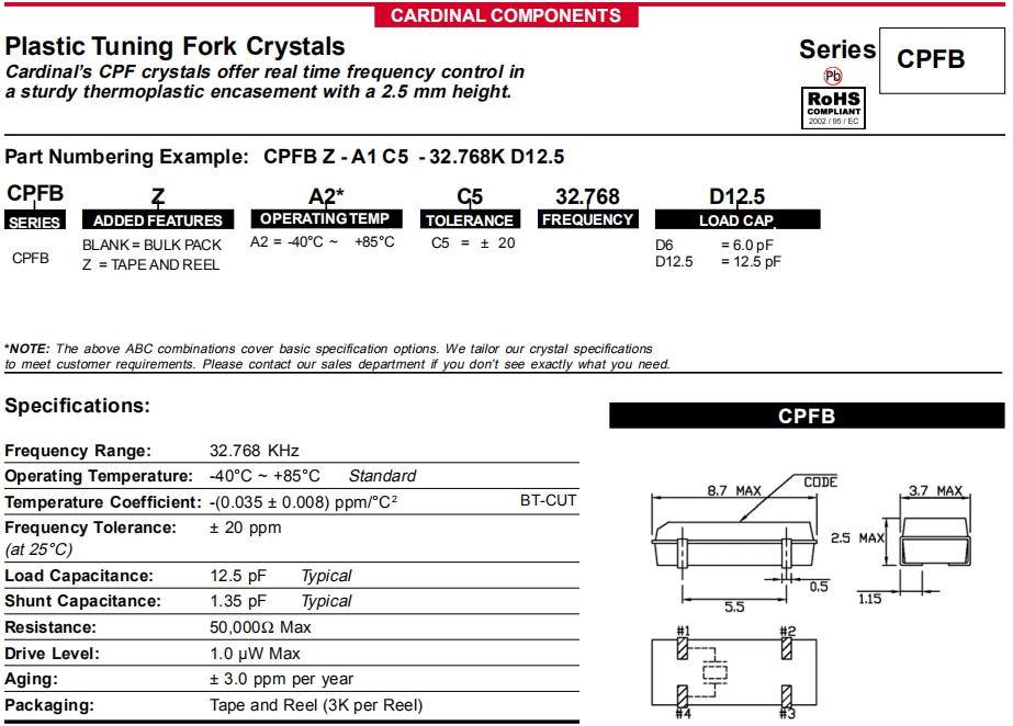 Cardinal晶振,CPFB晶振,時(shí)鐘晶體諧振器.32.768K系列具有超小型,薄型,質(zhì)地輕的表面貼片音叉型石英晶體諧振器,晶振產(chǎn)品本身具備優(yōu)良的耐熱性,耐環(huán)境特性,在辦公自動(dòng)化,家電領(lǐng)域,移動(dòng)通信領(lǐng)域可發(fā)揮優(yōu)良的電氣特性,符合無鉛標(biāo)準(zhǔn),滿足無鉛焊接的回流溫度曲線要求,金屬外殼的石英晶振使得產(chǎn)品在封裝時(shí)能發(fā)揮比陶瓷晶振外殼更好的耐沖擊性能.