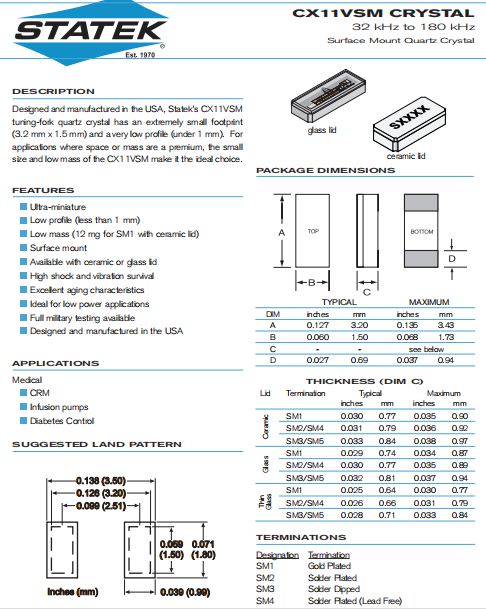 1970年,Statek無源晶振公司開創了石英計時元件小型化技術,革新了頻率控制行業.今天,Statek在設計和制造超微型石英晶體,振蕩器和傳感器方面延續了創新的傳統.自成立以來,Statek一直是創新,服務和質量的代名詞.所有產品都是在美國設計制造和測試的.