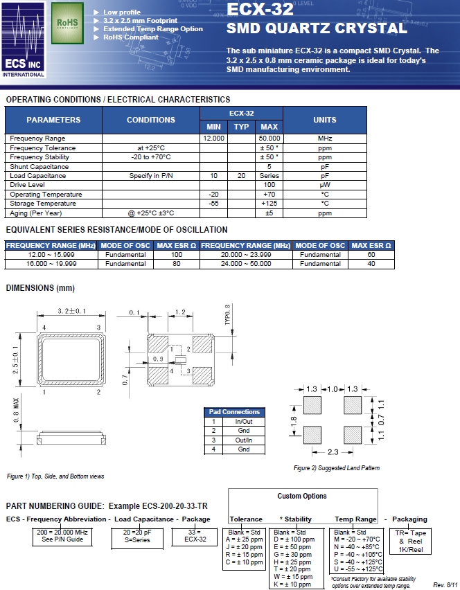 ECS晶振,ECS-320-20-33-CKM-TR無源晶振,ECX-32水晶振子.小型表面貼片型貼片晶振,較適合使用在數(shù)碼電子產(chǎn)品領(lǐng)域中,也是特別要求高可靠性的引擎控制用CPU的時鐘部分.低頻晶振可從12MHz起對應(yīng),小型,薄型具備強(qiáng)防焊裂性,石英晶體在惡劣嚴(yán)酷的環(huán)境條件下也能發(fā)揮穩(wěn)定的起振特性,產(chǎn)品本身具有耐熱,耐振,耐撞擊等優(yōu)良的耐環(huán)境特性,滿足無鉛焊盤以及高溫回流溫度曲線要求,符合AEC-Q200認(rèn)證.