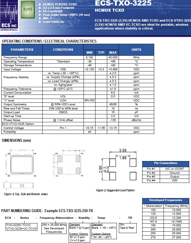 ECS晶振,ECS-TXO-3225-100-TR晶體振蕩器,ECS-TXO-3225振蕩子.小型貼片有源晶振,體積的變小也使產(chǎn)品帶來(lái)了更高的穩(wěn)定性能,接縫密封石英晶體振蕩器,精度高,覆蓋頻率范圍寬的特點(diǎn),貼片高速自動(dòng)安裝和高溫回流焊設(shè)計(jì),Optionable待機(jī)輸出三態(tài)輸出功能,電源電壓范圍:1.8V?5V,高穩(wěn)定性,低抖動(dòng),低功耗,主要應(yīng)用領(lǐng)域:無(wú)線通訊,智能手機(jī),平板筆記本W(wǎng)LAN,藍(lán)牙,數(shù)碼相機(jī),DSL和各式IT產(chǎn)品的晶振應(yīng)用,三態(tài)功能,PC和LCDM等數(shù)碼領(lǐng)域,符合RoHS/無(wú)鉛.