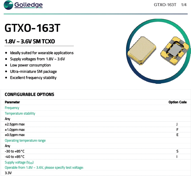 Golledge晶振,溫補振蕩器,GTXO-163T石英振蕩子.小型貼片有源晶振,體積的變小也使產品帶來了更高的穩定性能,接縫密封石英晶體振蕩器,精度高,覆蓋頻率范圍寬的特點,貼片高速自動安裝和高溫回流焊設計,Optionable待機輸出三態輸出功能,電源電壓范圍:1.8V?5V,高穩定性,低抖動,低功耗,主要應用領域:無線通訊,智能手機,平板筆記本WLAN,藍牙,數碼相機,DSL和各式IT產品的晶振應用,三態功能,PC和LCDM等數碼領域,符合RoHS/無鉛.