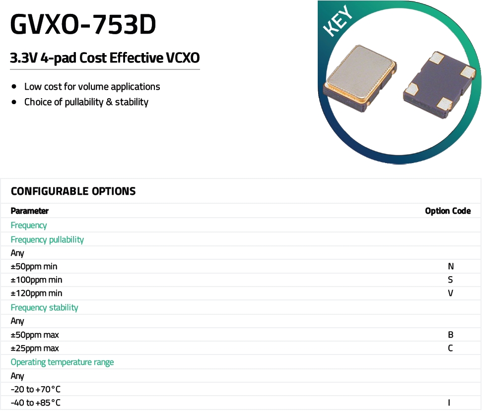 Goliedge晶振,SMD晶振,GVXO-753D石英振蕩器.貼片式石英晶體振蕩器,低電壓啟動功率,并且有多種電壓供選擇,比如有1.8V,2.5V,3.3V,3.8V,5V等,產品被廣泛應用于,平板筆記本,衛星系統,光纖通道,千兆以太網,串行ATA,串行連接SCSI,PCI-EXPress的SDH / SONET發射基站等領域.符合RoHS/無鉛.