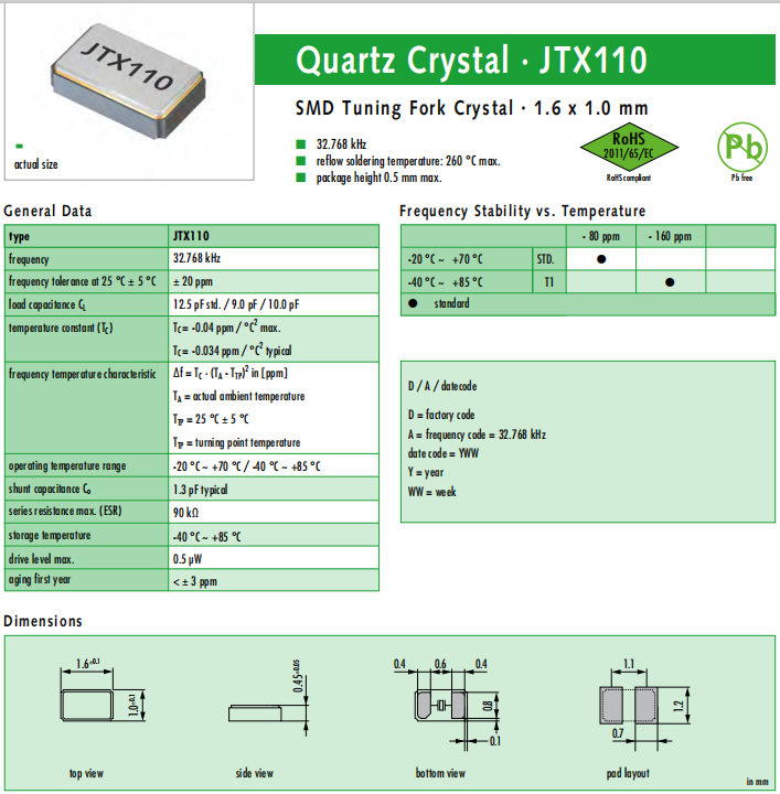 JAUCH晶振,JTX110晶振,32.768K無源晶體.普通貼片石英晶振外觀使用金屬材料封裝的,具有高穩(wěn)定性,高可靠性的石英晶體諧振器,晶振外觀本身使用金屬封裝,充分的密封性能,可確保其高可靠性,采用編帶包裝,外包裝采用朔膠盤,可在自動(dòng)貼片機(jī)上對(duì)應(yīng)自動(dòng)貼裝等優(yōu)勢(shì).