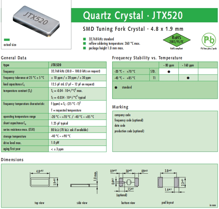 JAUCH晶振,JTX520晶振,高性能石英晶體.貼片晶振本身體積小,超薄型石英晶體諧振器,特別適用于有目前高速發(fā)展的高端電子數(shù)碼產(chǎn)品,因為晶振本身小型化需求的市場領(lǐng)域,小型,薄型是對應(yīng)陶瓷諧振器(偏差大)和普通的石英晶體諧振器(偏差小)的中間領(lǐng)域的一種性價比較出色的產(chǎn)品.產(chǎn)品廣泛用于筆記本電腦,無線電話,衛(wèi)星導(dǎo)航HDD, SSD, USB, Blu-ray等用途,符合無鉛焊接的高溫回流焊曲線特性.