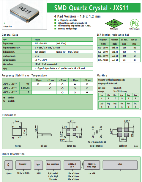 JAUCH晶振,JXS11晶振,高品質(zhì)諧振器.貼片石英晶體,體積小,焊接可采用自動(dòng)貼片系統(tǒng),產(chǎn)品本身小型,表面貼片晶振,特別適用于有小型化要求的電子數(shù)碼產(chǎn)品市場(chǎng)領(lǐng)域,因產(chǎn)品小型,薄型優(yōu)勢(shì),耐環(huán)境特性,包括耐高溫,耐沖擊性等,在移動(dòng)通信領(lǐng)域得到了廣泛的應(yīng)用,晶振產(chǎn)品本身可發(fā)揮優(yōu)良的電氣特性,達(dá)到了無(wú)鉛焊接的高溫回流溫度曲線的標(biāo)準(zhǔn).