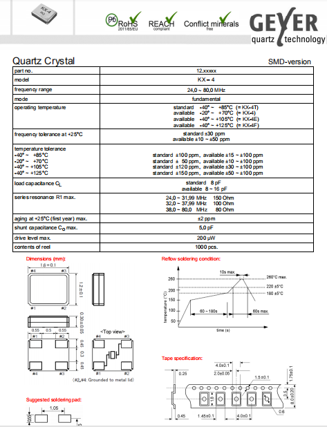 Geyer晶振,KX-4晶振,低功耗石英晶體.小型表面貼片晶振型,是標準的石英晶體諧振器,適用于寬溫范圍的電子數碼產品,家電電器及MP3,MP4,播放器,單片機等領域.可對應24.000MHz以上的頻率,在電子數碼產品,以及家電相關電器領域里面發揮優良的電氣特性,滿足無鉛焊接的回流溫度曲線要求.