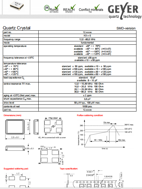 Geyer晶振,KX-6晶振,SMD晶體.普通石英晶振,外觀完全使用金屬材料封裝的,產品本身采用全自動石英晶體檢測儀,以及跌落,漏氣等苛刻實驗.產品本身具有高穩定性,高可靠性的石英晶體諧振器,焊接方面支持表面貼裝,外觀采用金屬封裝,具有充分的密封性能,晶振本身能確保其高可靠性,采用編帶包裝,可對應產品應用到自動貼片機告訴安裝,滿足無鉛焊接的高溫回流溫度曲線要求.