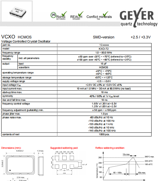 Geyer晶振,KXO-72晶振,環(huán)保振蕩器.具有最適合于移動通信設(shè)備用途的高穩(wěn)定的頻率溫度特性.為對應(yīng)低電源電壓的產(chǎn)品.(可對應(yīng)DC +1.8 V±0.1 V to +3.2 V±0.1 V )高度:最高1.0 mm,體積:0.007 cm3,重量:0.024g,超小型,輕型.低消耗電流,表面貼片型產(chǎn)品.(可對應(yīng)回流焊) 無鉛產(chǎn)品.滿足無鉛焊接的回流溫度曲線要求.