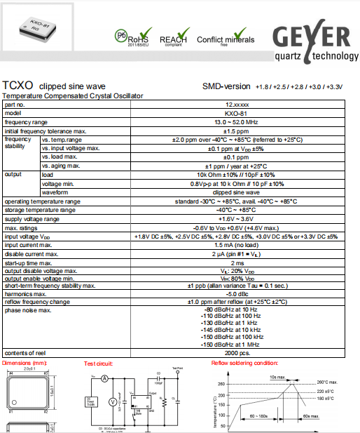 Geyer晶振,KXO-81晶振,有源晶振.小型SMD有源晶振,從最初超大體積到,有著翻天覆地的改變,體積的變小也使產(chǎn)品帶來了更高的穩(wěn)定性能,接縫密封石英晶體振蕩器,精度高,覆蓋頻率范圍寬的特點(diǎn),SMD高速自動安裝和高溫回流焊設(shè)計(jì),Optionable待機(jī)輸出三態(tài)輸出功能,電源電壓范圍:1.8~5 V,高穩(wěn)定性,低抖動,低功耗,主要應(yīng)用領(lǐng)域:無線通訊,高端智能手機(jī),平板筆記本W(wǎng)LAN,藍(lán)牙,數(shù)碼相機(jī),DSL和其他IT產(chǎn)品的晶振應(yīng)用,三態(tài)功能,PC和LCDM等高端數(shù)碼領(lǐng)域,符合RoHS/無鉛.