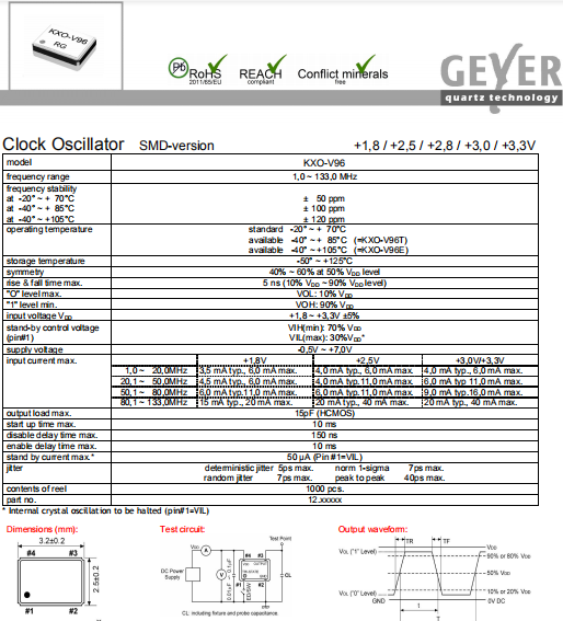Geyer晶振,KXO-V96晶振,時鐘有源振蕩器.貼片式石英晶體振蕩器,低電壓啟動功率,并且有多種電壓供選擇,比如有1.8V,2.5V,3.3V,3.8V,5V等,產(chǎn)品被廣泛應(yīng)用于,平板筆記本,GPS系統(tǒng),光纖通道,千兆以太網(wǎng),串行ATA,串行連接SCSI,PCI-Express的SDH / SONET發(fā)射基站等領(lǐng)域.符合RoHS/無鉛.