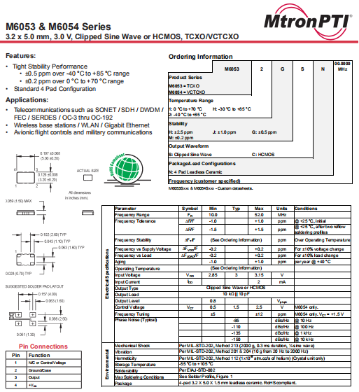 MTRONPTI晶振,M6053晶振,溫補(bǔ)晶體振蕩器.5032mm體積的石英晶體振蕩器,有源晶振,該產(chǎn)品可驅(qū)動2.5V的溫補(bǔ)晶振,壓控晶振,VC-TCXO晶體振蕩器產(chǎn)品,電源電壓的低電耗型,編帶包裝方式,可對應(yīng)自動高速貼片機(jī)自動焊接,及IR回流焊接(無鉛對應(yīng)),為無鉛產(chǎn)品,超小型,質(zhì)地輕.產(chǎn)品被廣泛應(yīng)用到集成電路,程控交換系統(tǒng),無線發(fā)射基站.