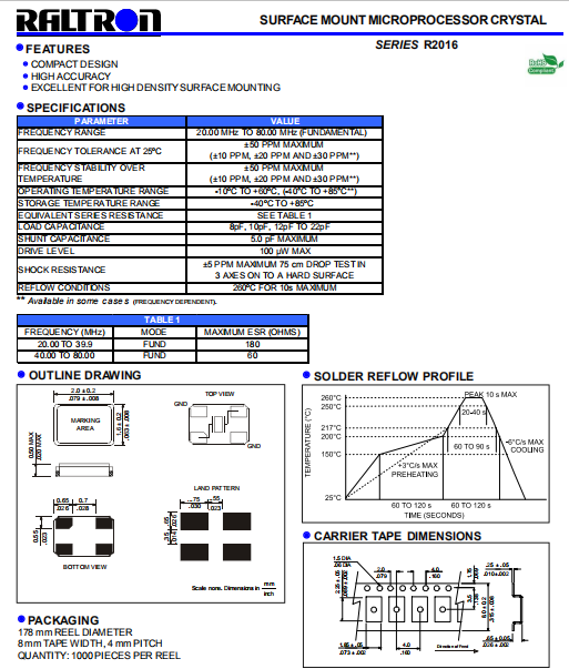 RALTRON晶振,R2016晶振,低功耗石英晶體.小型貼片石英晶振,外觀尺寸具有薄型表面貼片型石英晶體諧振器,特別適用于有小型化要求的市場領域,比如智能手機,無線藍牙,平板電腦等電子數碼產品.晶振本身超小型,薄型,重量輕,晶體具有優良的耐環境特性,如耐熱性,耐沖擊性,在辦公自動化,家電相關電器領域及Bluetooth,WirelessLAN等短距離無線通信領域可發揮優良的電氣特性,滿足無鉛焊接的回流溫度曲線要求.
