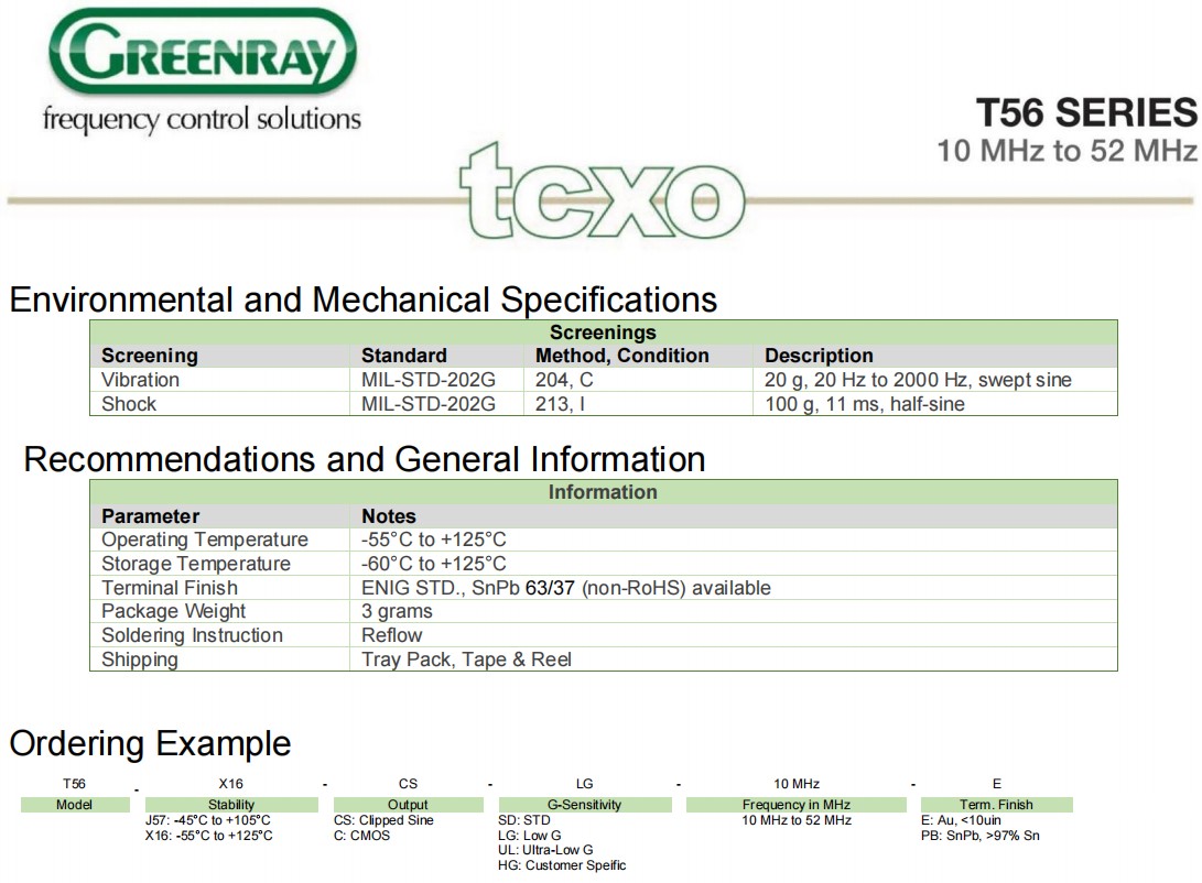 T56-J57-CS-LG-26MHz-E,5032mm,Greenray溫補晶振,T56,航空電子晶振,參數(shù)表