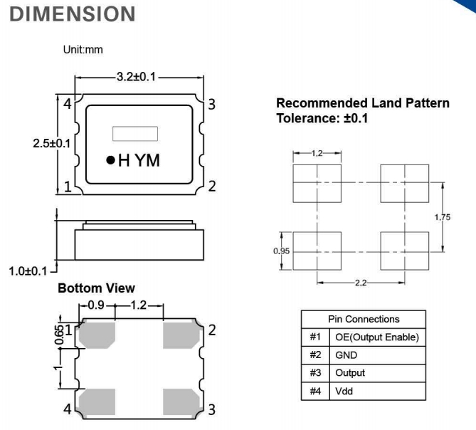 HELE加高3225振蕩器,SSW050000I3CHE-T,HSO321S有源晶體 尺寸圖