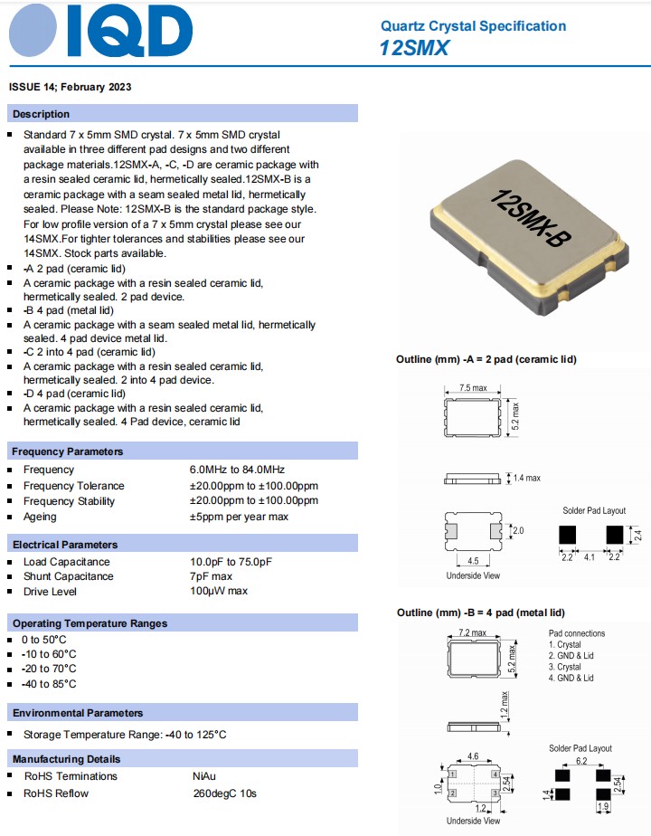 | LFXTAL026388REEL | IQD晶振 | 12SMX-B | CRYSTAL 14.7456MHZ 16PF SMD | 14.7456 MHz |