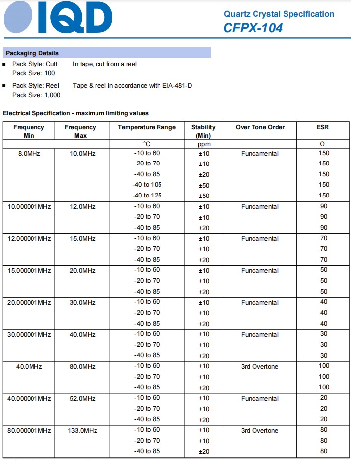 | LFXTAL061627REEL | IQD晶振 | CFPX-104 | CRYSTAL 8.0000MHZ 16PF SMD | 8 MHz |