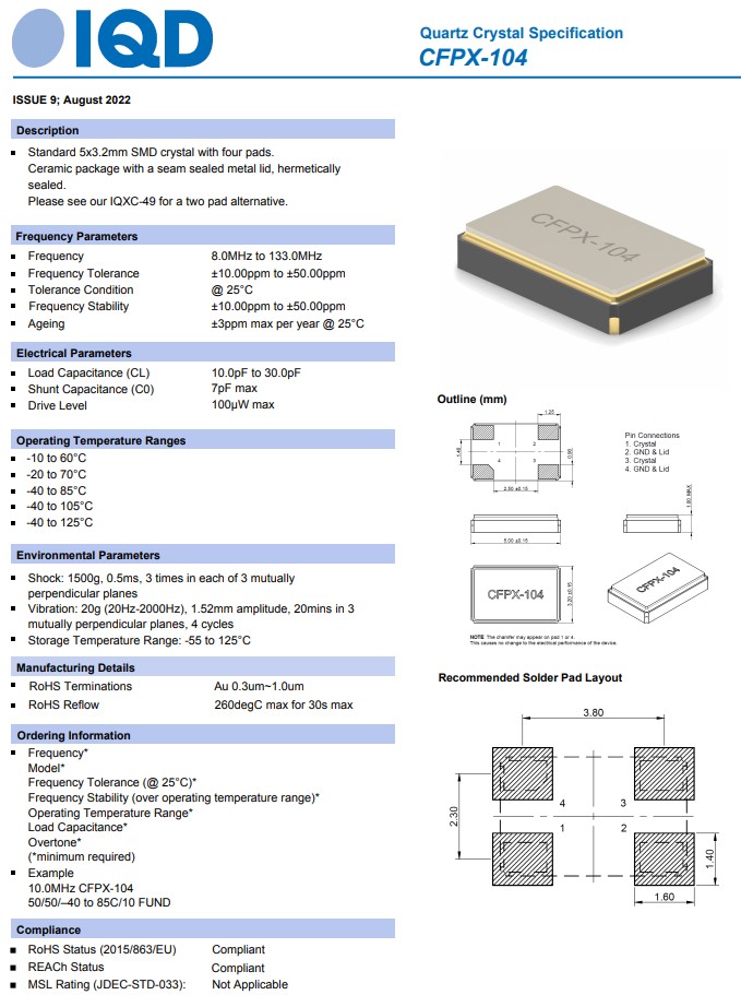 | LFXTAL056583REEL | IQD晶振 | CFPX-104 | CRYSTAL 10.0000MHZ 12PF SMD | 10 MHz |