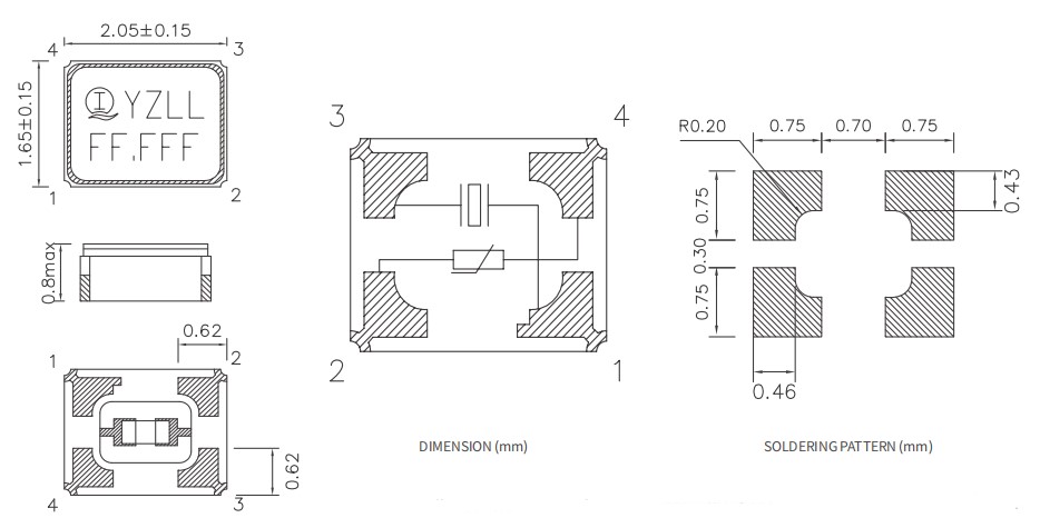 2016mm,THR-2016,Interquip應(yīng)達(dá)利晶振,石英晶體諧振器,超小型晶振,智能穿戴設(shè)備晶振,尺寸圖