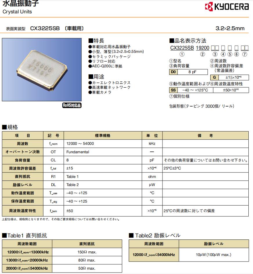| CX3225SB19200D0FLJCC | AVX Corp/Kyocera Corp | CX3225SB, Kyocera | MHz Crystal | 19.2MHz |