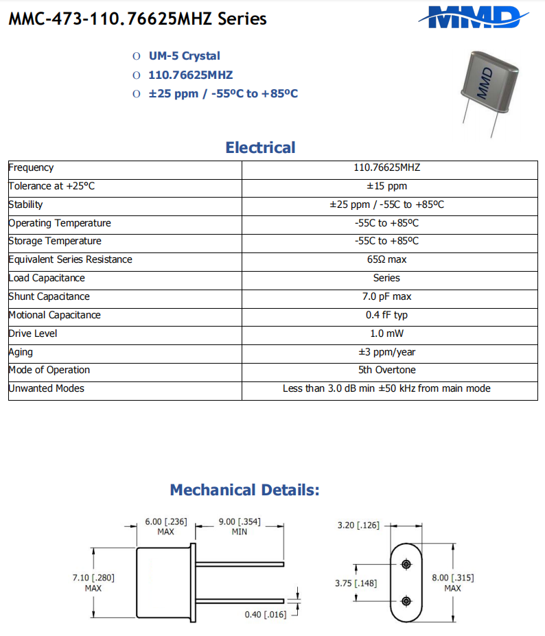 Mmdcomp插件石英晶體,MMC-473-110.76625MHZ,電話機6G晶振,通訊設(shè)備晶振,小體積晶振,參數(shù)表