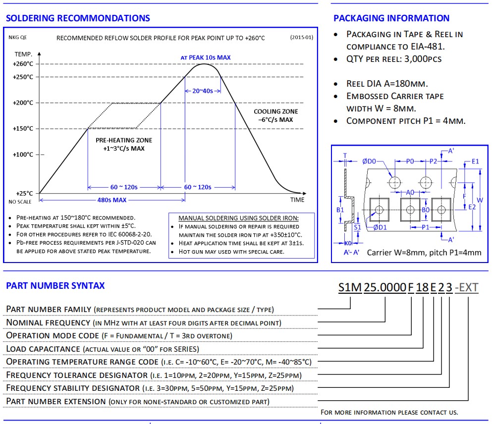 香港NKG無源晶振,S1M26.0000F18M23-EXT,USB內存設備6G晶振,香港NKG晶振,型號S1M系列,編碼為:S1M26.0000F18M23-EXT,頻率為:26MHz,小體積晶振尺寸1.6x1.2x0.4mm,四腳貼片晶振,石英晶體諧振器,無源晶振,無鉛環保晶振,具有超小型,輕薄型,優異的耐熱性和抗沖擊性。由于真空密封,可靠性高,老化率低。汽車級產品符合AEC-Q200標準。S1M系列無源晶振應用于:無線,藍牙,Mobil通信,小型便攜式設備,USB內存設備,智能手機,平板電腦,可穿戴設備等應用。