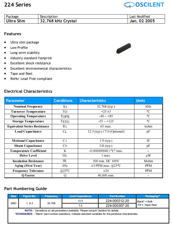 224-000312-20,7015mm,32.768KHz,Oscilent品牌,晶振廠家,陶瓷晶振,參數表