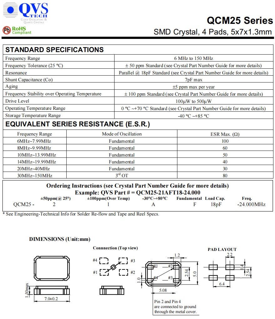 | Resonance | Parallel @ 18pF Standard (see Crystal Part Number Guide for more details) |