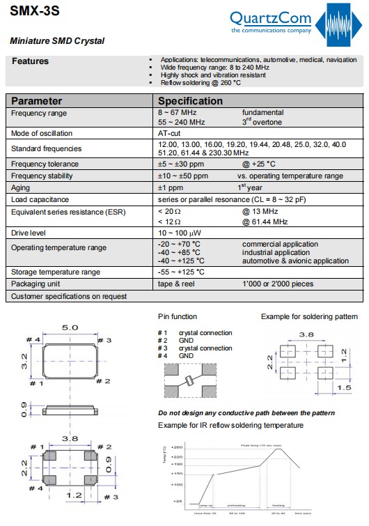 QuartzCom石英通晶振,SMX-3S四腳貼片晶振,導(dǎo)航6G晶振,5032mm晶振,電信應(yīng)用晶振,瑞士進(jìn)口晶振,QuartzCom石英通晶振,型號(hào):SMX-3S,小體積晶振尺寸:5.0x3.2mm封裝,四腳貼片晶振,頻率范圍:8MHz~240MHz,石英晶體諧振器,無(wú)源晶振,石英晶振,SMD石英晶體,無(wú)鉛環(huán)保晶振,貼片石英晶振,工作溫度范圍:-20 ~ +70°C商業(yè)應(yīng)用,-40 ~ +85°C工業(yè)應(yīng)用,-40 ~ +125°C汽車(chē)和航空電子應(yīng)用,高沖擊和抗振動(dòng)?回流焊@ 260°C。具有超小型,輕薄型,高性能,高精度,高可靠性,耐熱及耐環(huán)境特點(diǎn)。應(yīng)用于:電信、汽車(chē)電子、醫(yī)療設(shè)備、導(dǎo)航,無(wú)線網(wǎng)絡(luò),藍(lán)牙模塊,航空航天,物聯(lián)網(wǎng)等應(yīng)用。