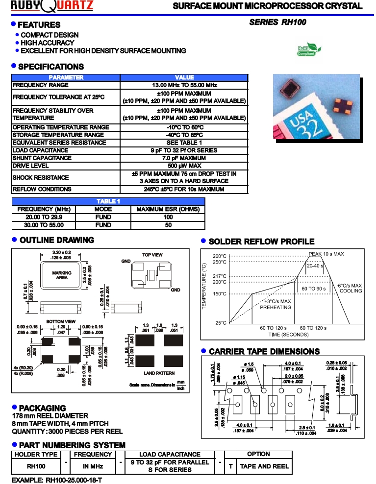 RH100-16.000-12T/6G智能音響晶振/Rubyquartz無源諧振器 參數表