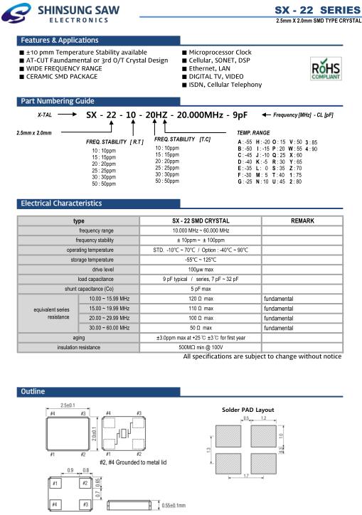 美國SHINSUNG晶振,SX-22以太網專用晶振,SX-22-20-20HZ-20.000MHz-7pF晶振,小型貼片石英晶振,外觀尺寸具有薄型表面貼片型石英晶體振蕩器,特別適用于有小型化要求的市場領域,比如智能手機,無線藍牙,平板電腦等電子數碼產品.晶振本身超小型,薄型,重量輕,SMD石英晶體具有優良的耐環境特性,如耐熱性,耐沖擊性,在辦公自動化,家電相關電器領域及Bluetooth,WirelessLAN等短距離無線通信領域可發揮優良的電氣特性,滿足無鉛焊接的回流溫度曲線要求.