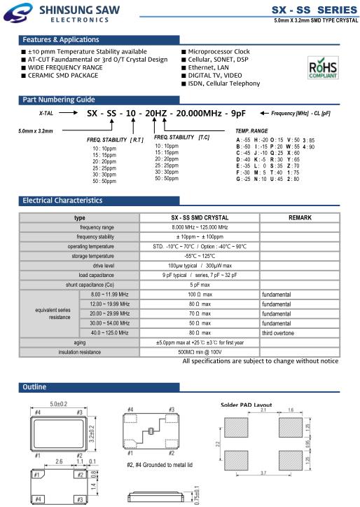 SHINSUNG晶振,SX-SS蜂窩電話晶振,SX-SS-10-20HZ-20.000MHz-9pF晶振,智能手機晶振,產品具有高精度超小型的表面貼片型石英晶體振蕩器,最適用于移動通信終端的基準時鐘等移動通信領域.比如智能手機,無線通信,衛星導航,平臺基站等較高端的數碼產品,晶振本身小型,薄型具備各類移動通信的基準時鐘源用頻率,貼片晶振具有優良的電氣特性,耐環境性能適用于移動通信領域,滿足無鉛焊接的高溫回流溫度曲線要求.
