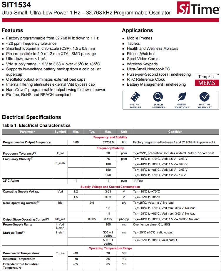 SiTime晶體振蕩器,SiT1534AI-H4-D14-32.768,健身手表6G晶振,可編程晶振,2012mm貼片晶振,美國進(jìn)口晶振,SiTime晶振,型號(hào):SiT1534,編碼為:SiT1534AI-H4-D14-32.768,頻率為:32.768KHz,小體積晶振尺寸:2.0x1.2mm,SMD晶振,四腳貼片晶振,石英晶振,有源晶振,石英晶體振蕩器。超小,超低功率1Hz-32.768kHz可編程晶振,工廠可編程從32.768kHz到1Hz,<20ppm頻率公差,超低功率: <1µA,Vdd供應(yīng)范圍: 1.5V到3.63V超過55°C+85°C,支持低壓電池備份從硬幣電池或超級(jí)帽,振蕩器輸出消除外部負(fù)荷帽,內(nèi)部過濾消除外部Vdd旁路帽,納米驅(qū)動(dòng)™可編程輸出擺動(dòng)最低功率,Pb無,RoHS和達(dá)到兼容。應(yīng)用于:手機(jī),平板電腦,健康和健康監(jiān)視器,健身手表,運(yùn)動(dòng)視頻攝像頭,無線鍵盤,超小筆記本電腦,每秒脈沖(pps)計(jì)時(shí),RTC參考時(shí)鐘,電池管理計(jì)時(shí)。