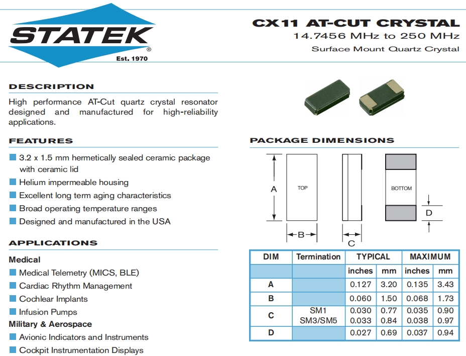 SMD晶振產(chǎn)品適用于范圍廣泛,適合用于心律管理,人工耳蝸,輸液泵,軍事與航空航天,航空電子指示器和儀器,駕駛艙儀表顯示器,數(shù)據(jù)通信,遙測(cè),工業(yè)、計(jì)算機(jī)和通信,通訊,變送器,脈沖發(fā)生器,跟蹤信標(biāo),野生動(dòng)物遙測(cè)等領(lǐng)域.CX11SCSM1-26.0M,50/50/-/I,9pF,Statek貼片晶體,6G儀器設(shè)備晶振.