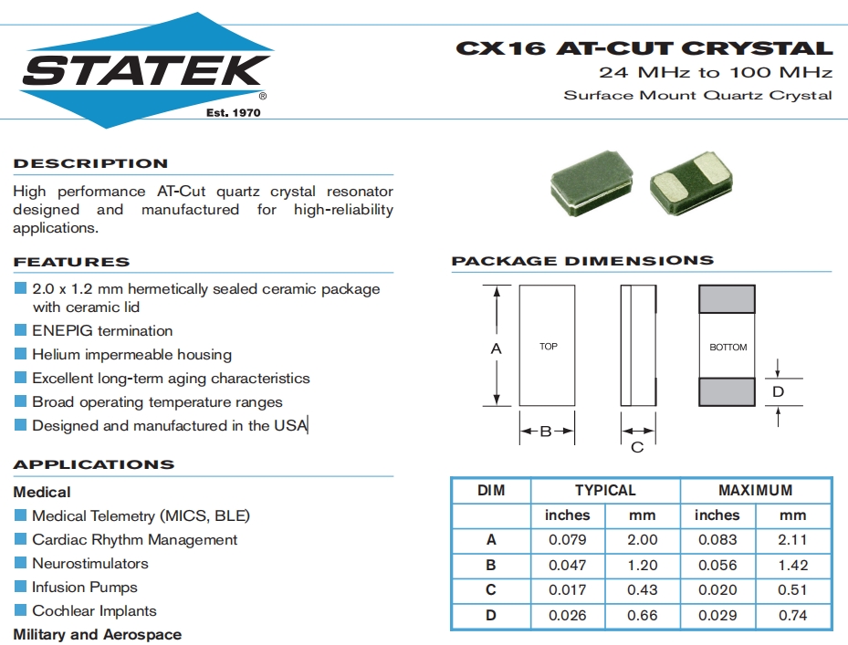 6G通訊晶振,美國Statek斯塔克晶體,CX16SCSM1-48.0M,20/10/-/S,9pF,尺寸2012mm,頻率48MHZ,Statek無源晶振,美國斯塔克晶振,歐美進口晶振,水晶振動子,兩腳貼片晶振,貼片無源晶振,輕薄型晶振,2012mm音叉晶體,無源音叉晶體,無源貼片晶振,無源晶振,SMD晶體諧振器,兩腳貼片晶振,陶瓷晶振,航空航天晶振,軍事應用晶振,數據通信晶振,通訊設備晶振,計算機專用晶振,脈沖發生器晶振,高品質晶振,高性能晶振,低損耗晶振,低成本晶振。高性能AT切割石英晶體諧振器設計和制造具有高可靠性應用程序。