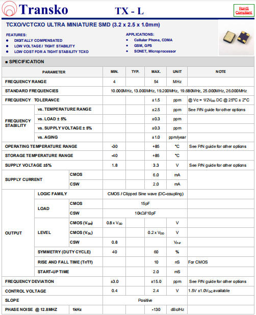 Transko晶振,TX-L晶振,VC-TCXO振蕩器.具有最適合于移動(dòng)通信設(shè)備用途的高穩(wěn)定的頻率溫度特性.為對(duì)應(yīng)低電源電壓的產(chǎn)品.(可對(duì)應(yīng)DC +1.8 V±0.1 V to +3.2 V±0.1 V )高度:最高1.0 mm,體積:0.007 cm3,重量:0.024g,超小型,輕型.低消耗電流,表面貼片型產(chǎn)品.(可對(duì)應(yīng)回流焊) 無(wú)鉛產(chǎn)品.滿足無(wú)鉛焊接的回流溫度曲線要求.