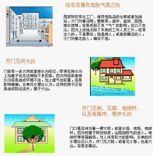 忌天斬煞。所謂“天斬煞”是指兩幢高樓大廈之間的一條狹窄空隙;因為好像用刀從半空斬成兩半,故此稱為天斬煞。倘若房屋面對“天斬煞”,很可能會有血光之災(zāi):空隙愈狹長便愈兇,距離愈近便愈險!故此宜選擇面對天斬煞的房屋居住,但若是在其背后有另一建筑物填補(bǔ)空隙則不妨。忌箭煞。“箭煞”是指住宅門外見尖銳的墻角沖射,尖引破財?shù)脑颍嗯c不列問題有關(guān):因為身體健康總問題而破財;被他人欺騙而破財。化煞的方法要從。“天地人”著手,在門檻藏五帝錢,這是地化煞法;在門楣掛一個凸鏡,這是天化煞法;在廳拉環(huán)位置掛一用口含拉環(huán)的獸頭牌,這是人化煞法。