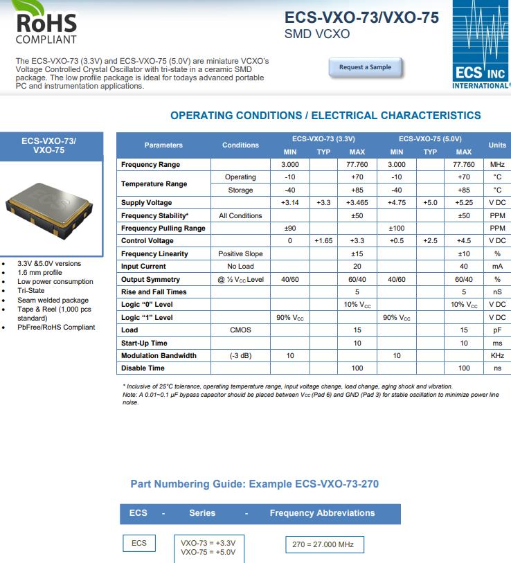 編碼ECS-VXO-73-25.00-TR,ECS-VXO-73 (3.3V)和ECS-VXO-75 (5.0V)是一款7050mm,頻率25MHZ,微型VCXO在陶瓷SMD中具有三態的壓控晶體振蕩器包中。低調的包裝是理想的今天先進的便攜式PC和儀表應用。